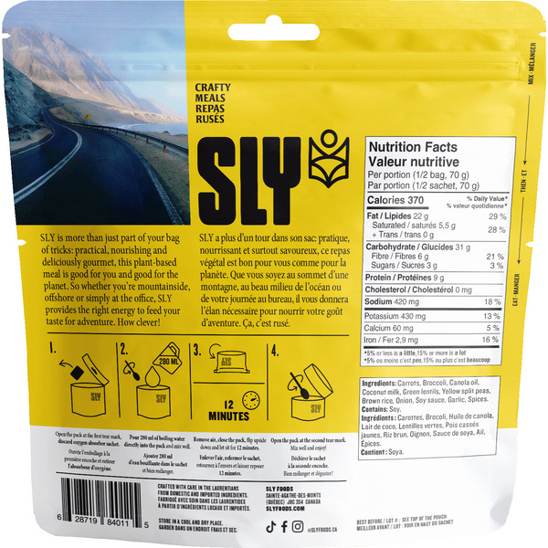 Carrots, Broccoli, Canola oil, Coconut milk, Green lentils, Yellow split peas, Brown rice, Onions, Soy sauce, Garlic, Spices, Herbs.
